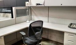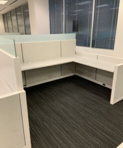 These Allsteel workstations are perfect in any office atmosphere. The glass paneling allows for privacy and communication between employees.