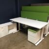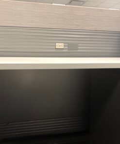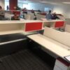 Herman Miller 47″ Tall Etho Space Workstations 6′ x 6′ in size. These Herman Miller Etho Space Workstations feature white surfaces, light grey trim, light blue fabric panels, rail tile management, paper management, one stationary BBF pedestals, and one stationary BB pedestal.