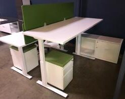product catalogKnoll Sit to Stand L-Shape Desks feature adjustable electric base, white credenza, white mobile pedestals, and light green fabric privacy dividers.