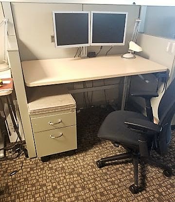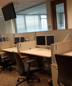 The Steelcase Answer Series create spaces within the open floor plan that help your organization balance collaboration and privacy, support mobility and optimize real estate, through the broadest range of applications with flexibility to adapt as your organization’s needs shift. The Answer Series frame supports extensive integration of storage and worksurfaces to efficiently support you and your work in exactly the footprint you need. These workstations feature a 30″x 60″ Sit to Stand work surfaces, one b/b/f filling pedestal unit, 54″ height of spine, 42″ height of perpendicular, and dual arm monitor mounts.