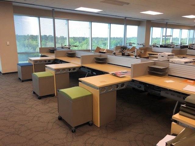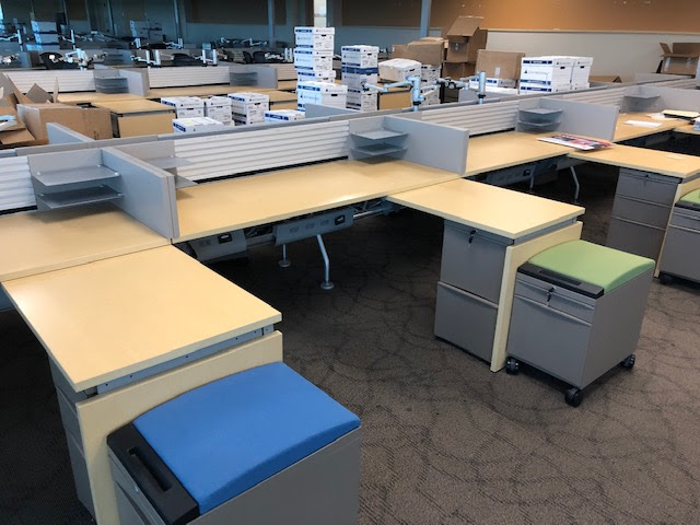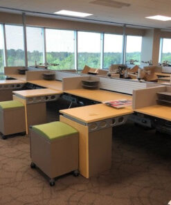 These Teknion Benching Workstations include one stationary box/box/file storage unit, one mobile box/file storage unit with cushion top, 6′ x 5′ size, dual monitor arms, honey finish surfaces, rail tile, paper management, cable management, and silver finish support. The Teknion Marketplace Benching reinvents the worktable, achieving an uninterrupted and unsupported span up to 20 feet that fosters creativity and collaboration in team-based office environment. Marketplace Benching is a visually dramatic response for open collaborative work-spaces including meeting, touch-down and team areas; as well as open plan spaces designed to accommodate multiple project teams. By nature, teamwork and collaborative environments require less space. Marketplace benching is scaled to respect space limitations, accommodating eight 60-inch-wide work desks while cleverly incorporating human aspects of work – personalization of space, storage and well-designed privacy options – which offer a more adept approach to smaller spaces. Generous wire management capabilities make it ideal for technologically intense applications