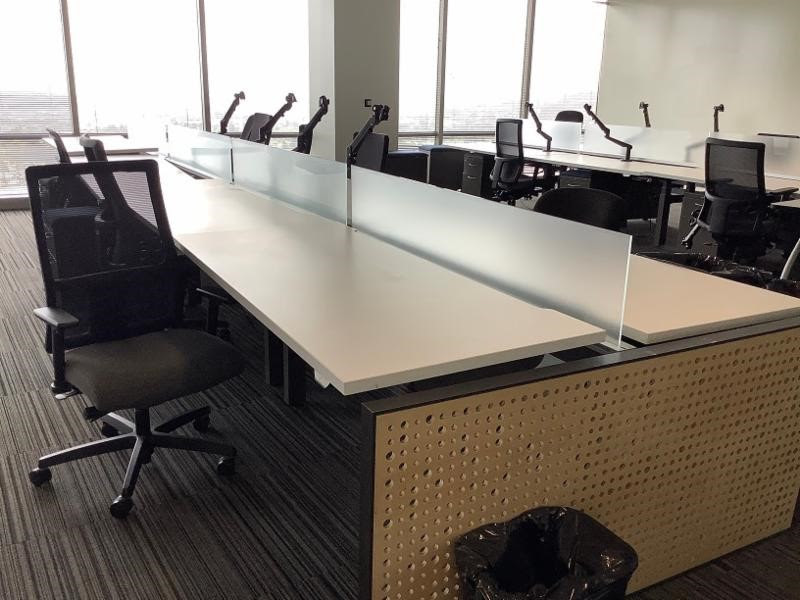 These sit to stand benching systems make for a great collaborative work environment. Sit to stand allows your employees to sit and relax, or stand if the need to. Glass panels allow for privacy when needed while still being able to communicate effectively with each other.