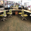 Hon work station with shelving, file cabinet and additional space for storage underneath. The dimensions of this piece are 7’x 6′, 6’x 5′ or 5’x 5′ with the panels being 50″ tall. The uniquely curved shape of the desk top allows for comfortable seating and makes maneuvering across your work space simple.