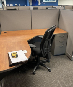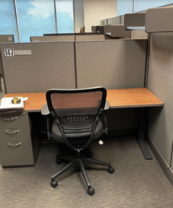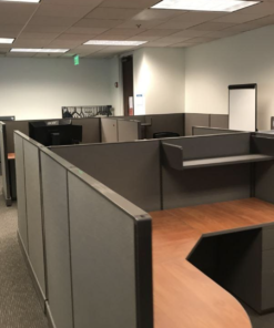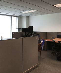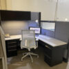 Herman Miller AO2 53 high fabric 6×6 stations, with new style power, corner, 24D BBF support pedestal, low shelf, and adjustable height radius end wing worksurface-basefeeds.
