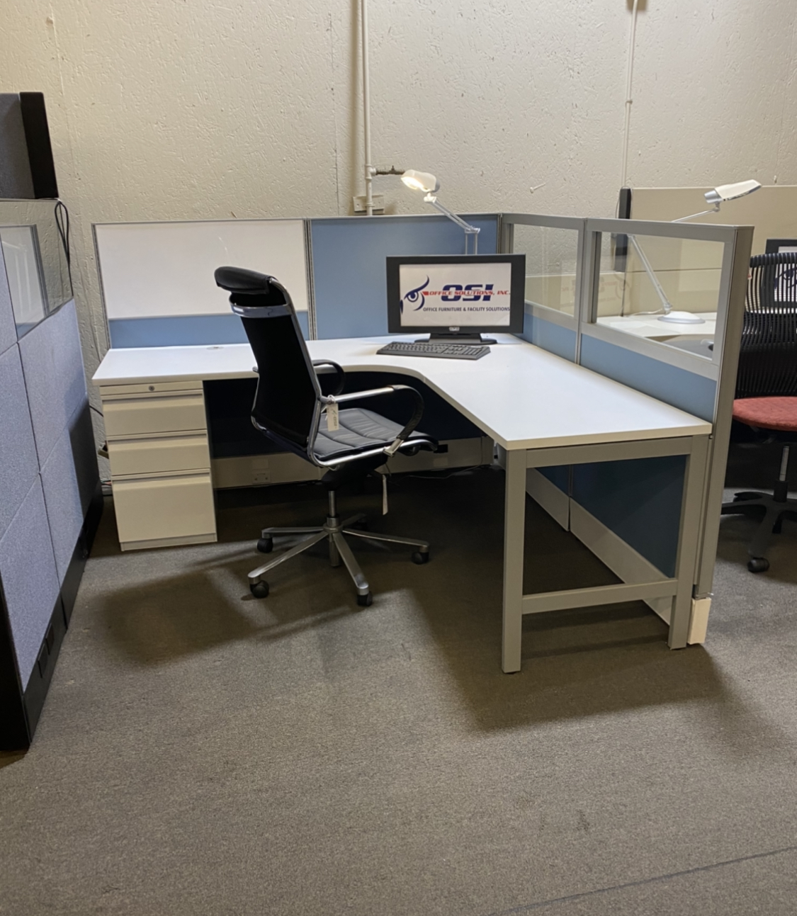 AIS Cubicle with glass stackers along with built-in dry erase board, and white contemporary tops with a filing unit.