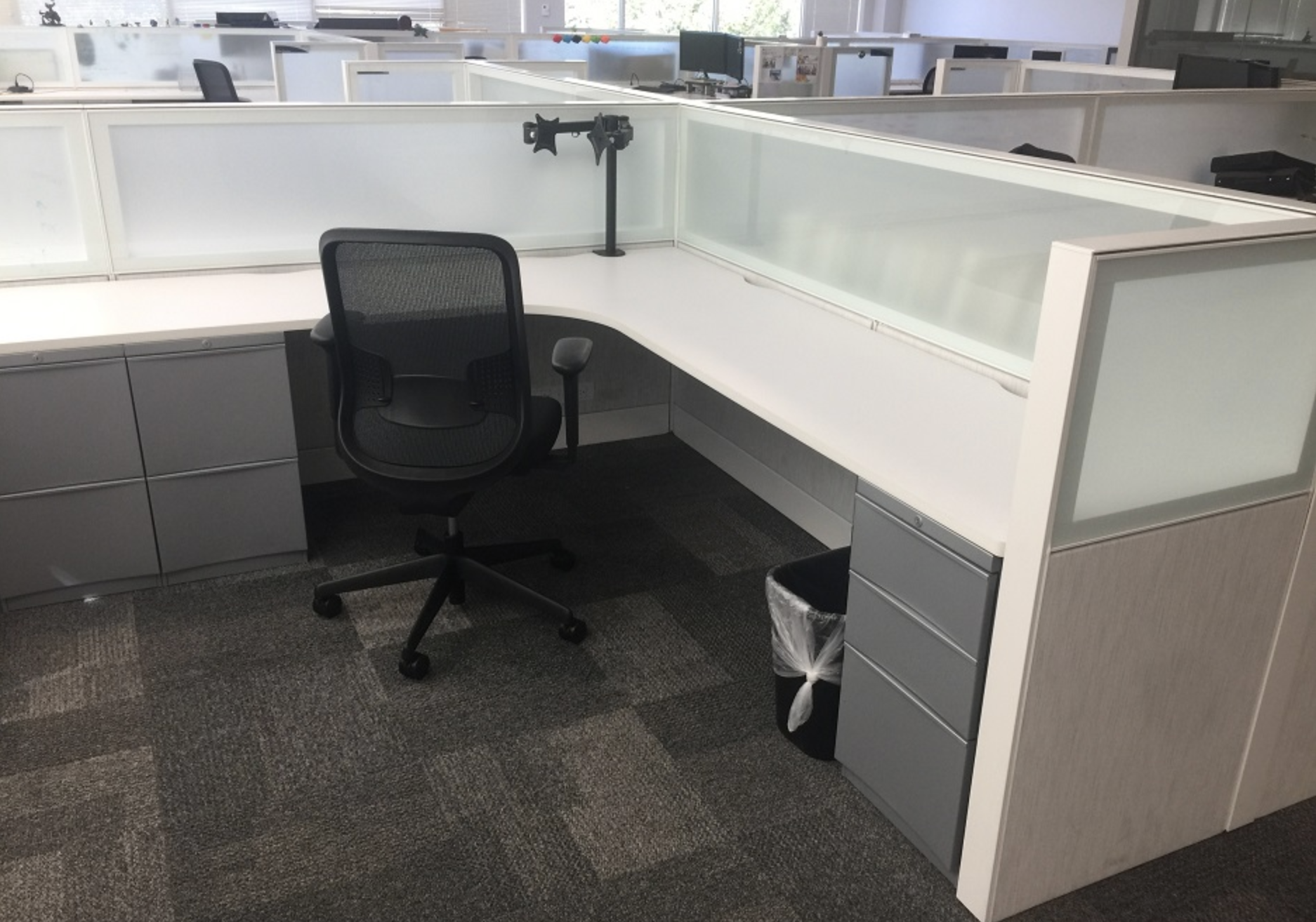 6×8 Teknion Leverage: all panels 48″H, frosted glass tiles, handed extended corners, floor supporting BBF & FF pedestals.