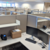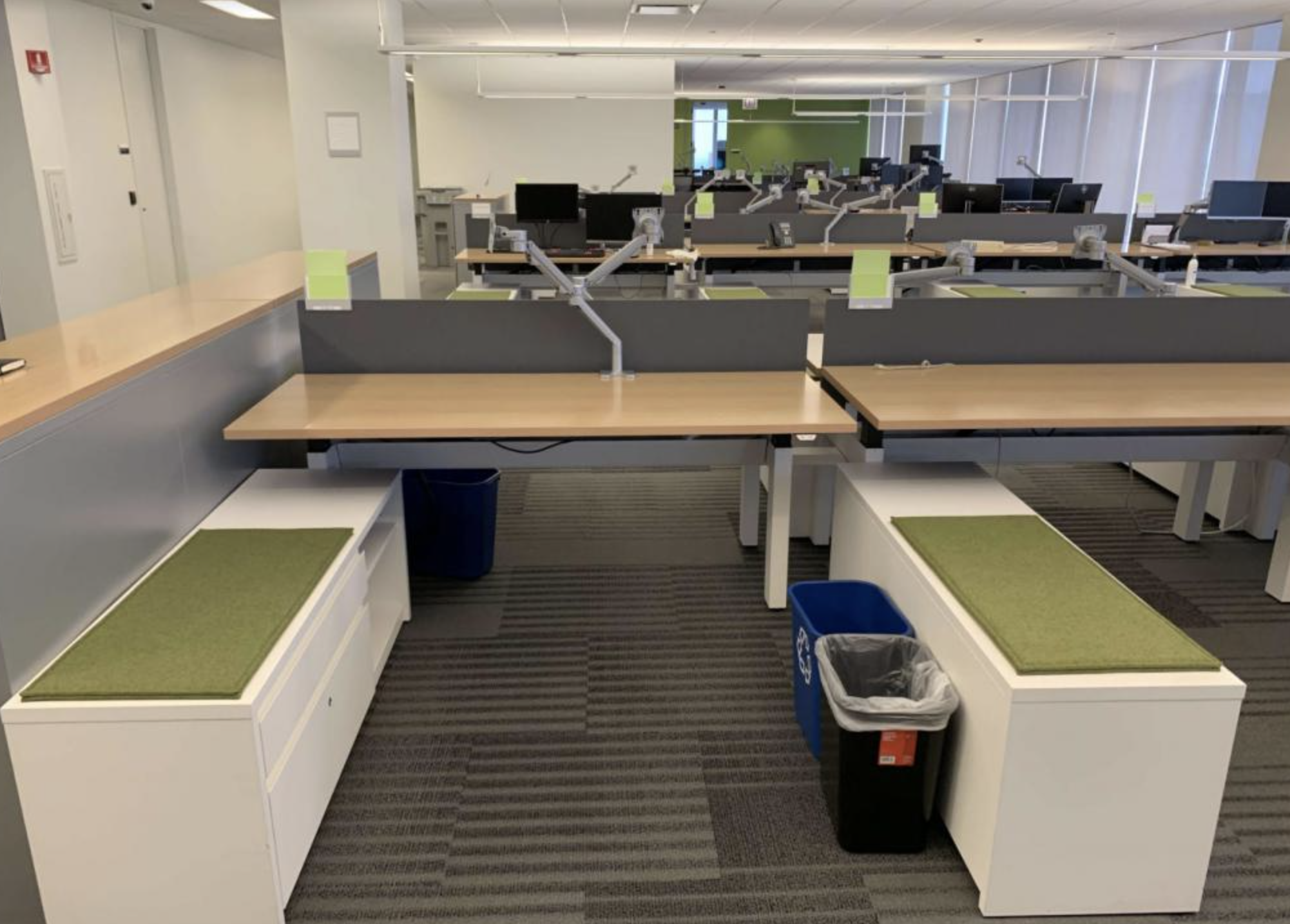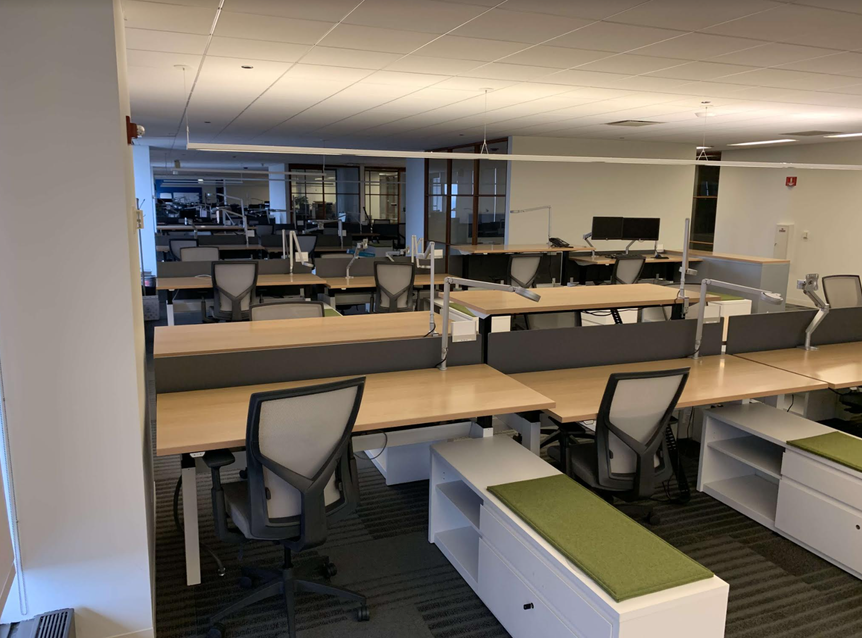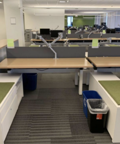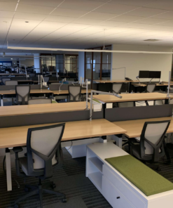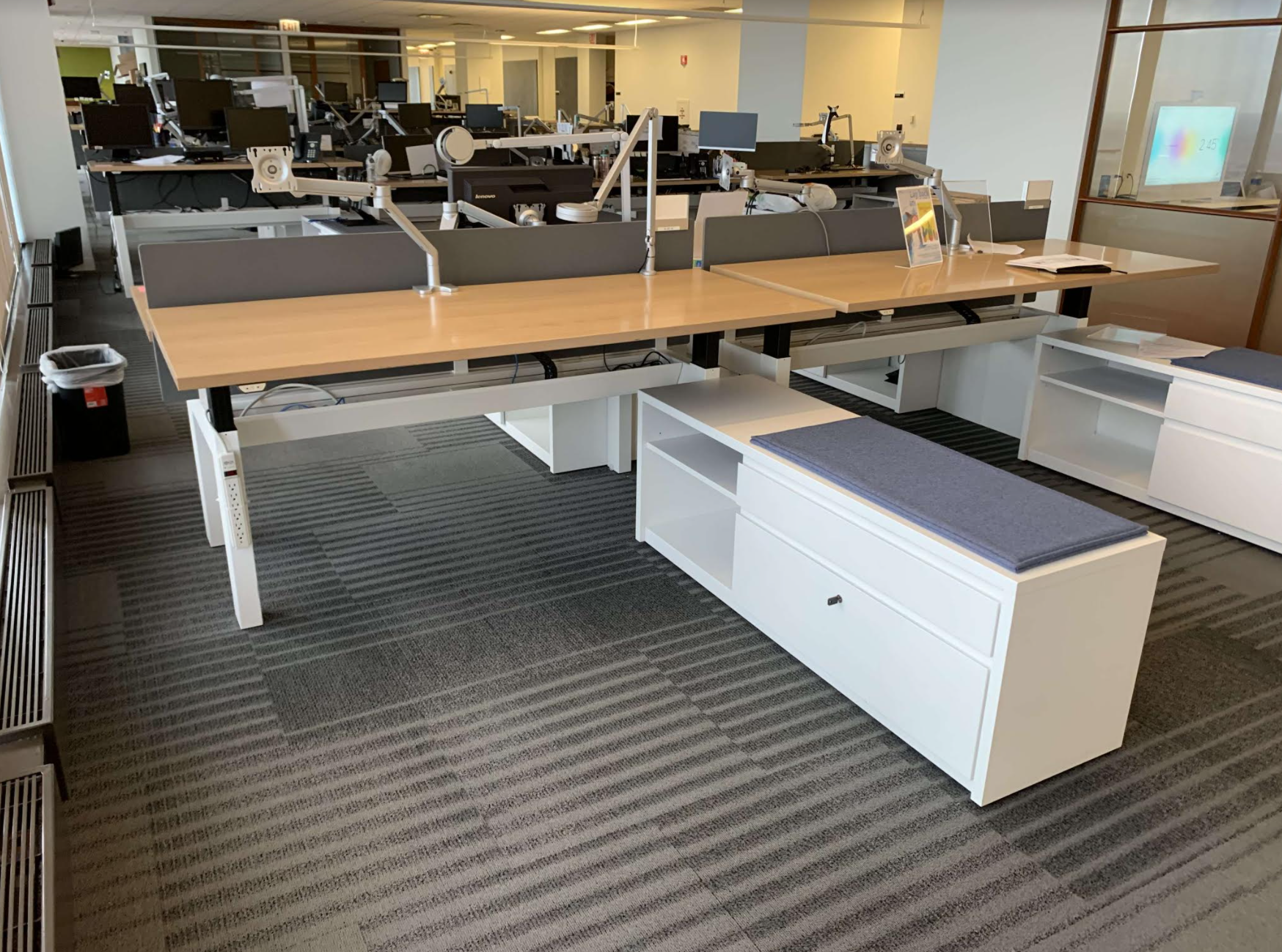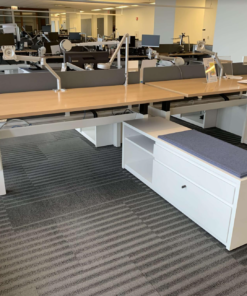 Haworth benching stations with sit to stand desks. Includes 30×70 Desk and 18×60 Credenza with cushion top.