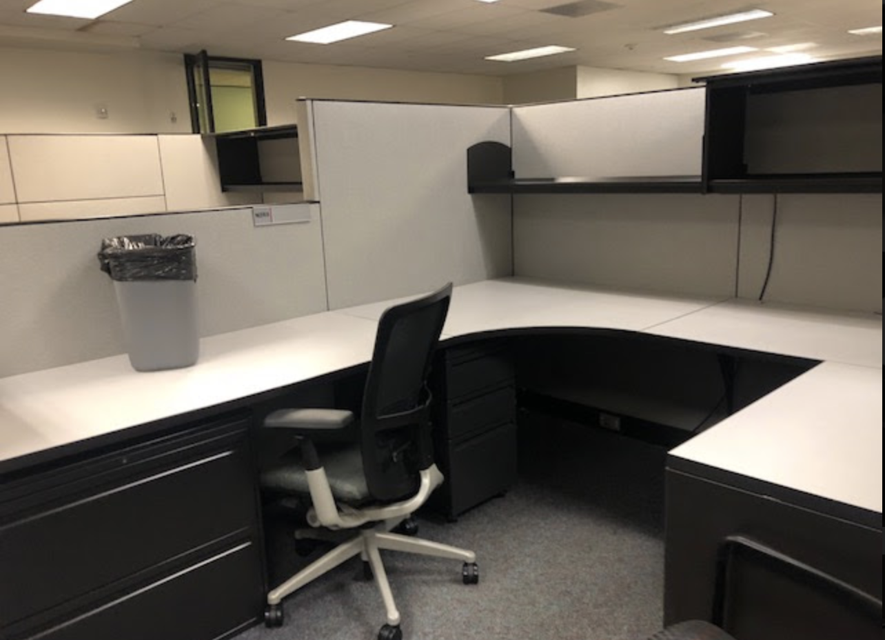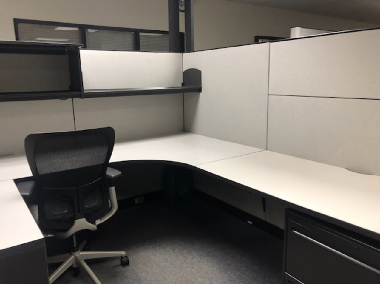 6×8 Haworth Premise units with one BBF freestanding ped, a 30” 2 drawer lateral file, one overhead, an open shelf, 64” to 48” panel dropdown and a power strip down the spine.
