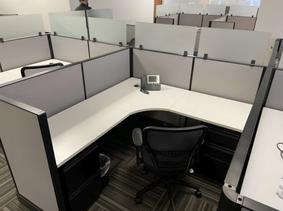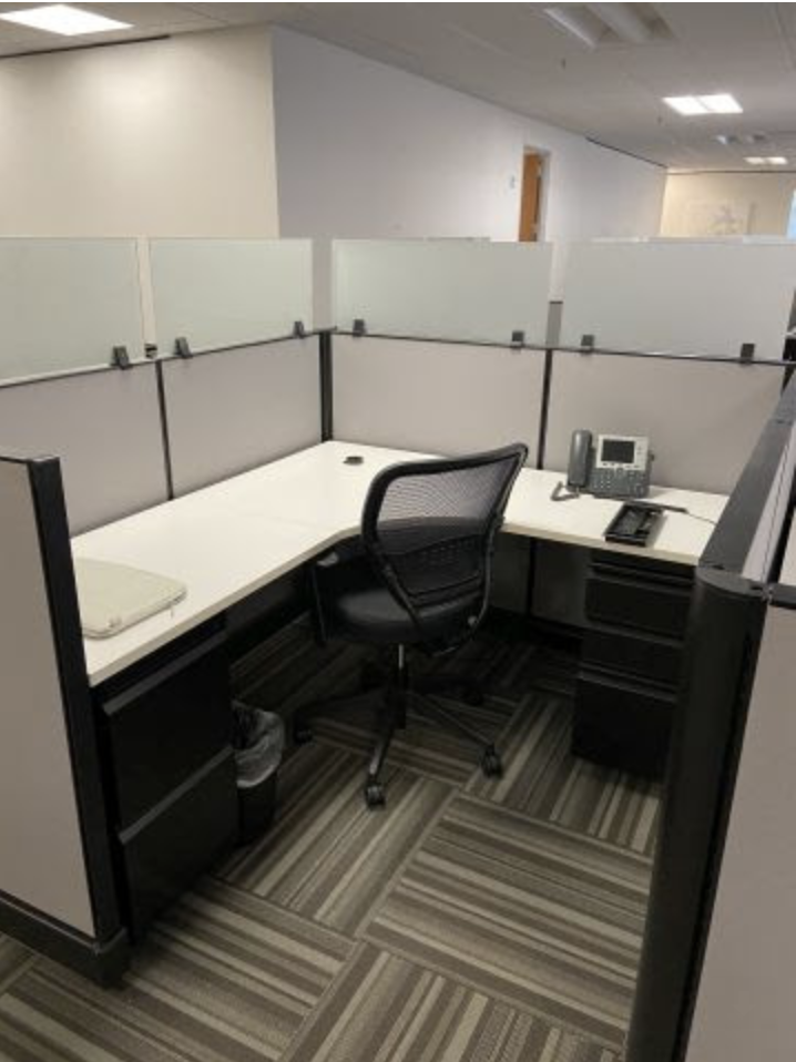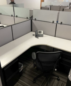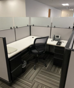 AO2 workstation that is 47” tall with AO2 panels and in the Guilford Bailey series. Includes Sherman Pewter fabric, Black Umber paint and White laminate work surfaces. Dimensions are 5 ½ on the spine and 6’ on Perpendicular. Most are podded and have frameless glass on the spine panels and along main aisle ways. Also includes BBF and FF pedestal.