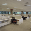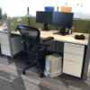 Knoll benching stations that are mostly back to back. Work surfaces are 27.5 x 60 and have glass down the center.
