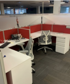 AIS Divi workstations with dimensions of 5’ x 5’ x 42”h and 12” frosted acrylic dividers on every station. All stations are powered – each station has a BBF pedestal drawer. The Interior fabric is red and storm grey. Work surface laminate is Designer White along with the paint color and base trim.
