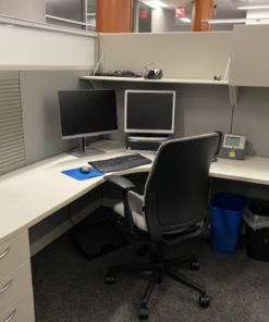 8×7 65″H Steelcase Answer: This immaculate inventory comes with 48″ Open Shelf, 48″ OH, BBF & 30″ two draws. All wing panels come with frosted glass. Very clean with great neutral colors.
