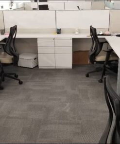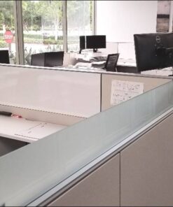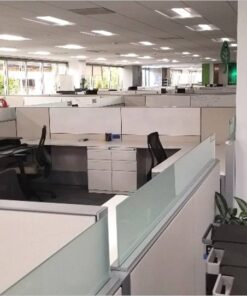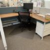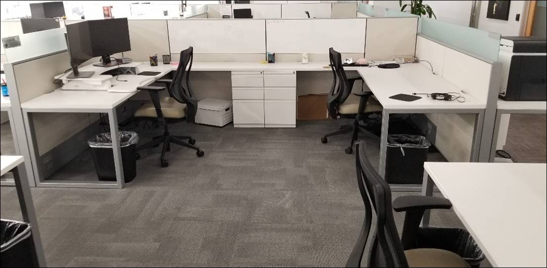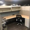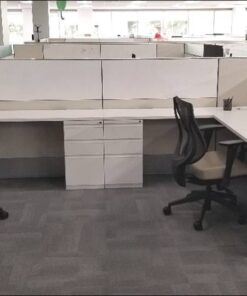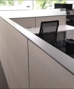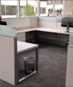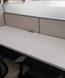 Haworth Compose Workstations with a height of 50″. Stations are back to back 6’ x 7’ and panel widths are 4’ and 2’ on the 6-foot side and a pair of 42” on the 7-foot side. Each station includes 2 – worksurfaces (1- 5’6” x 30”, 1- 6’ x 18”), 1- pop-up power grommet, 1- markerboard tile, and 1- BBF pedestal. Trim is silver, the fabric is a neutral beige tone pattern fabric, laminate is white and pedestals are also white.