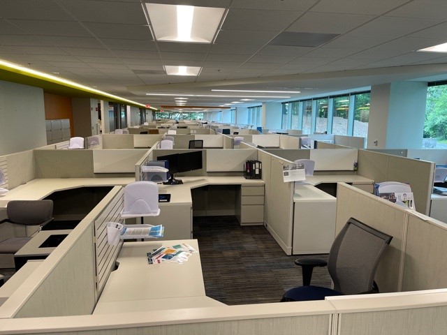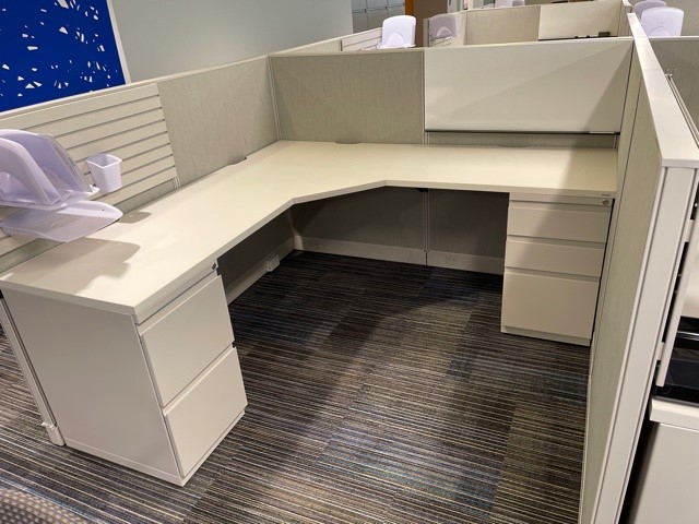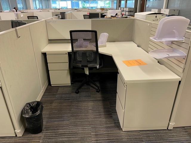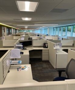 Haworth 6×6 stations in like-new condition. Each station has two pedestals and plenty of under and over the desk and storage. Also includes white board and space for filing.