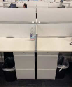 Mid-Height 6×6’s with glass. 6×6’s have 54″ high panels with framed glass off spine, 42″ high fabric panels on spine with 12″ frosted plexi-glass. All Panels are 36″ wide. Framed glass is 72″ wide one piece. Stations include pneumatic height main worksurface, mobile box/file pedestal with cushion top, framed glass off spine, frosted plexiglass along spine, 24″ deep locking file/file pedestal, belt-height power, tackable and marker-board tiles, andpower down spine with Base-in feeds. Choice of fabric, laminate, and metal finishes. Call today or visit our showroom for more information!