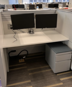 Haworth Compose mid-high 6x42x51 workstations. Stations include marker board on perpendicular panel and 24×15 mobile ped. Call or visit the showroom for more information!