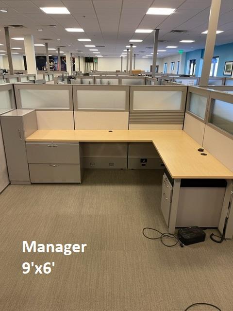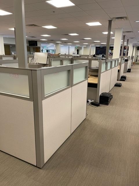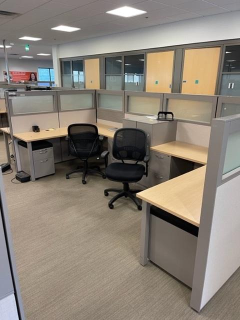 6’x6′ AIS work stations with under-desk storage and frosted glass paneling. Sleek gray design with laminated word surface space. Power sources can be seen lining the base of the cube. Customizable to customer preferences. Call today for more information!