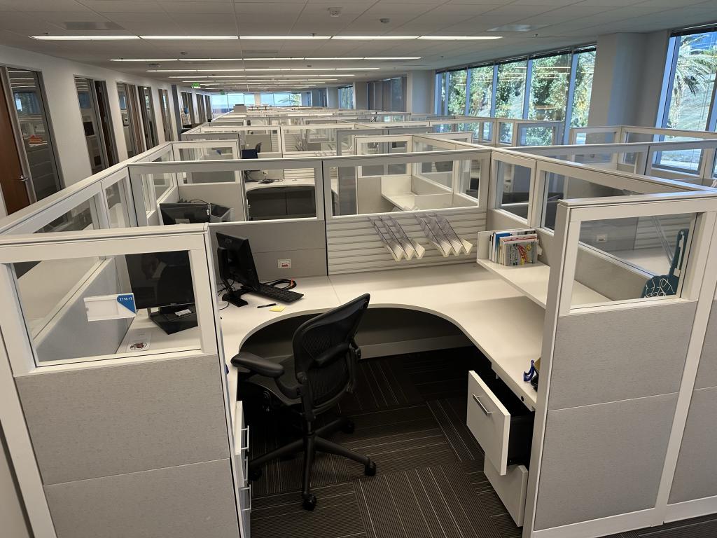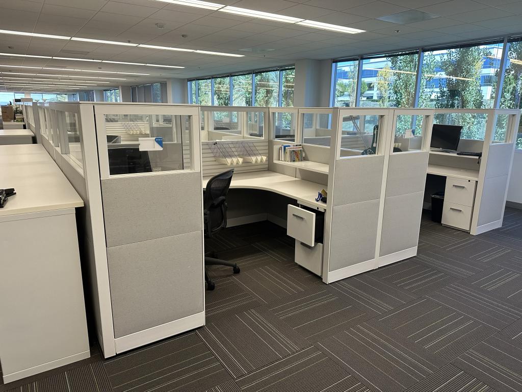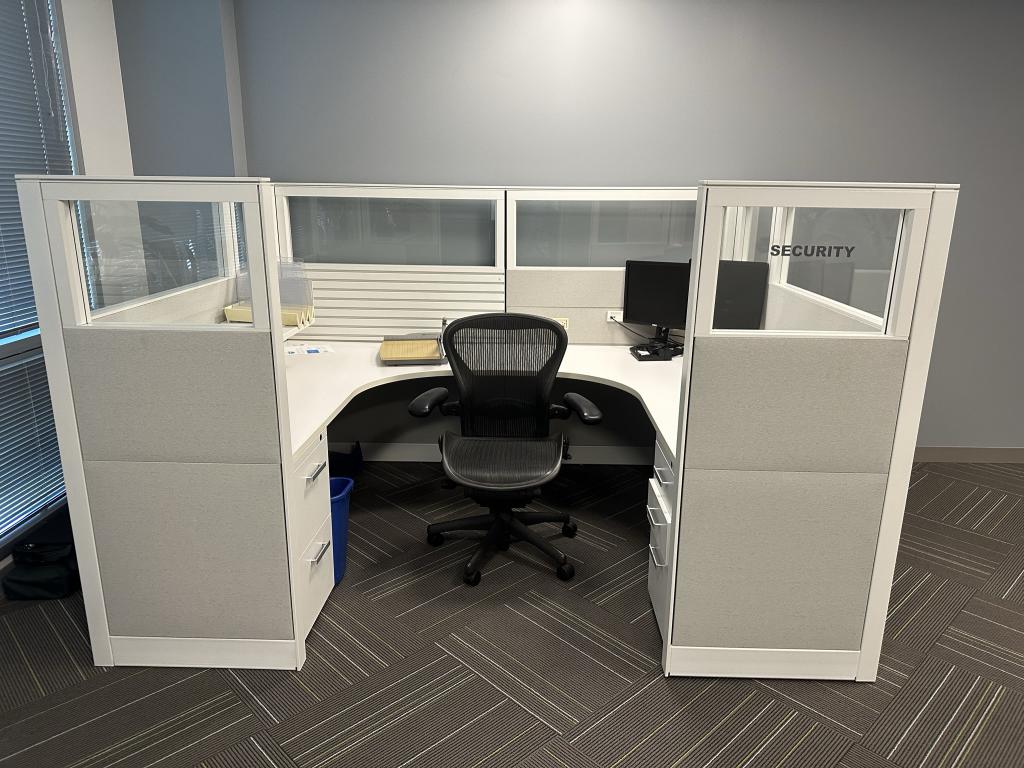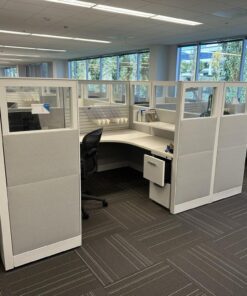 Friant Ethospace 62″ all glass work stations in 6×8 and 6×6. Stations include box-box-file, file-file, beltline power and open shelf cluster formation. Customizable to customer preference. Call today for more information!