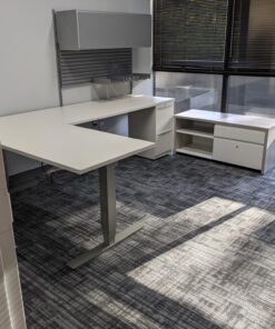 product catalogL-Shape Height-Adjustable Desk now available! This set up includes tackboards, overhead storage, an FF pedestal, and a benching credenza. Call today or visit or our showroom for more details.
