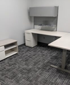 L-Shape Height-Adjustable Desk now available! This set up includes tackboards, overhead storage, an FF pedestal, and a benching credenza. Call today or visit or our showroom for more details.