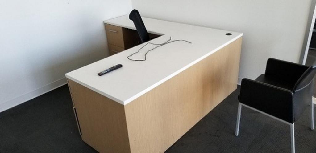 Haworth L Shaped Office Desks. Desks are maple with white work surfaces. Desks available in two sizes 60″x30″ and 72″x30″. Both left and right returns 42″x19″ and 48″x19″. Matching overhead storage available