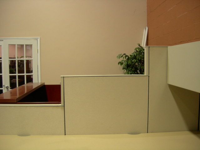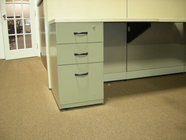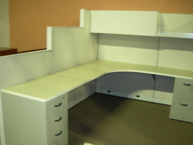 Steelcase Answers used workstations. Variable height acoustical panels drop down from 65″ to 53″ to 41″. Primary work surface with support, corner worksurface, secondary worksurface, box/box/file pedestal, file/file pedestal, open shelf unit, enclosed overhead unit, task light unit.