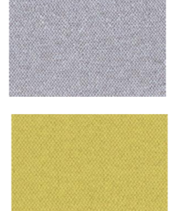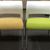 Café-Height Shortcut X-Base Breakroom Stool Chair, Lightweight Polypropylene Shell and Metallic Frame, White Shell with Light Gray or Yellow Fabric Seat.